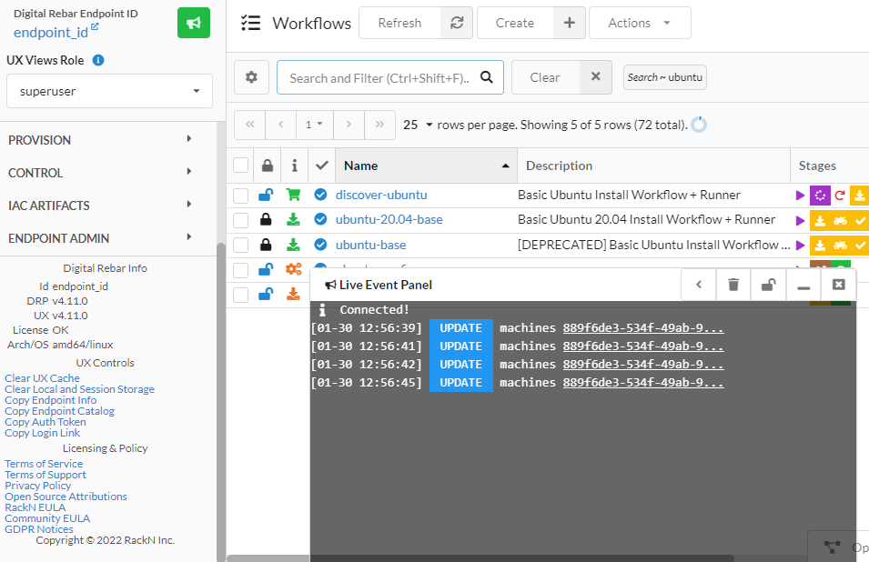 The RackN Portal connects to DRP via the REST API and maintains a Websocket connection to receive updates. It provides various tables, inspectors, and some wizards for browsing the state and health of an endpoint. It also provides access to RackN's self service license manager for self-guided trials.